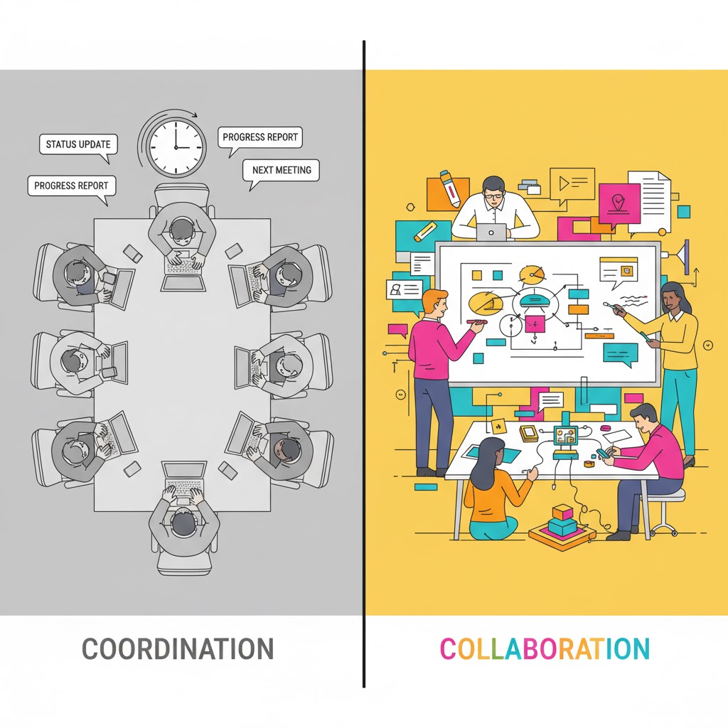 하지만 이런 소통의 대부분이 과연 협업(collaboration)을 위한 것일까요? 그렇지 않습니다. 그저 조정(coordination)일 뿐인데요, 이처럼 많은 이들이 조정을 협업으로 착각하고 있습니다.