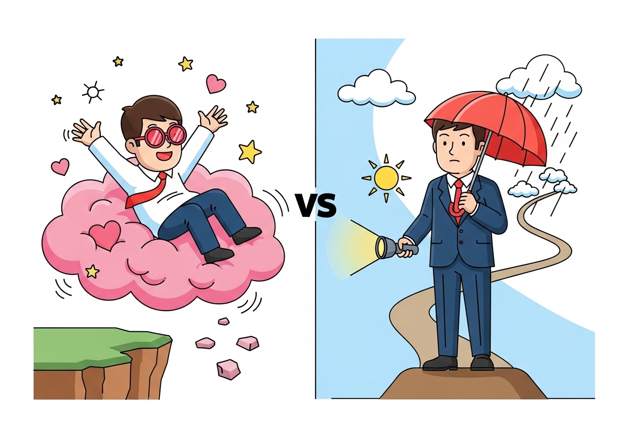 그렇다면 왜 긍정적으로 생각하는 사람들이 오히려 더 불행한 걸까요? 그것은 낙관주의자들이 '부정확한 기대'에 기반하여 의사결정을 하기 때문입니다. 높은 기대감을 갖는 낙관주의자들은 현실이 기대에 미치지 못할 때 엄청난 실망감을 경험합니다. 시간이 지나면서 이 실망감이 축적되어 처음의 긍정적 감정을 압도하는 겁니다.