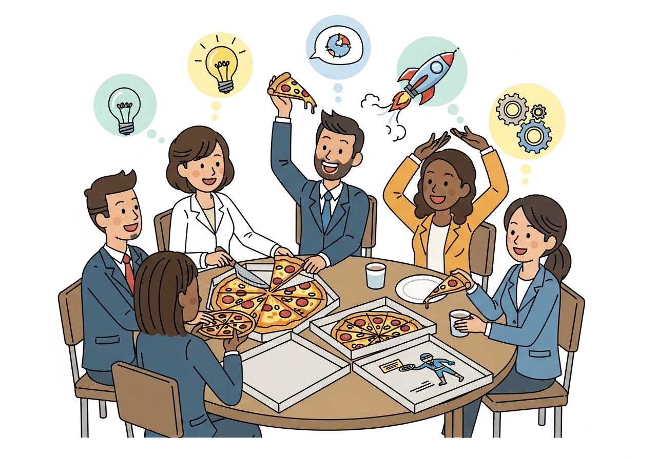 여러분의 조직은 혁신을 꾀한다고 "일단 사람부터 모으자!"라고 말하며 대규모 팀을 꾸리지는 않나요? 혁신은 팀 규모가 아니라 팀의 몰입에서 나옵니다. 다음에 혁신 프로젝트를 시작하고자 한다면 '피자 두 판' 정도로 충분한 규모로만 팀을 구성하기 바랍니다. (끝)