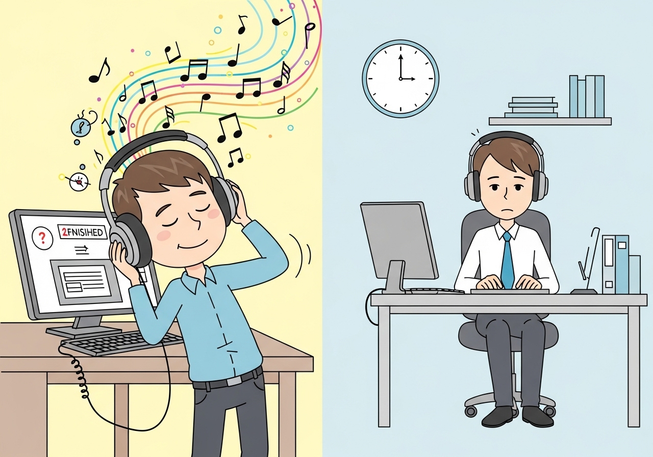 사실, 우리가 좋아하는 음악은 인지적인 부담을 크게 줍니다. 제가 곧잘 '당하는' 것처럼, 일하려는 우리의 의지력을 음악이 가져가 버리고 말죠. 일을 시작하고 10~30분 정도는 괜찮지만, 장시간 음악에 노출되면 업무에 쓸 의지력이 부족해지는 겁니다.