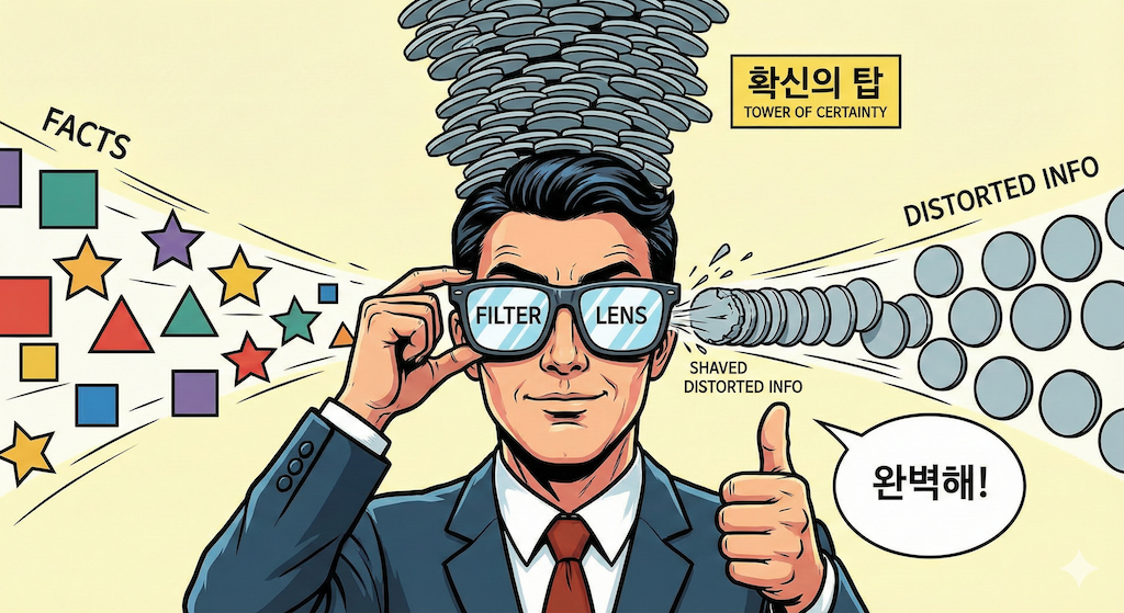 - 정보의 오염: 그 후부터 뇌에 들어오는 모든 새로운 정보를 A안에 유리하도록 비튼다. 중립적인 정보는 'A안의 잠재력을 보여주는 신호'라고 여기고, 부정적인 정보는 '일시적인 잡음이야'라고 무시한다.