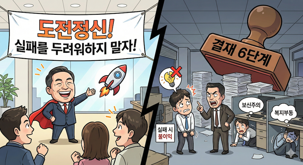 예를 들어, '실패를 두려워 하지 않는 도전정신'을 지향한다고 선언했다고 해보죠. 그러면 바로 우리 회사의 조직문화 특성 중 하나가 도전정신이 될까요? 그렇지 않습니다. 누가 혁신적인 아이디어를 낸다 하더라도 그게 실행이 되려면 지루한 결재 라인을 무려 6단계나 거쳐야 한다면요? 게다가 결과가 실패로 끝냈다고 해서 그 아이디어를 실행한 사람에게 불이익을 준다면요? 이런 관행이 떡 하니 자리잡고 있으니 실제로는 '보신주의'와 '복지부동'이라는 문화가 요지부동일 겁니다.