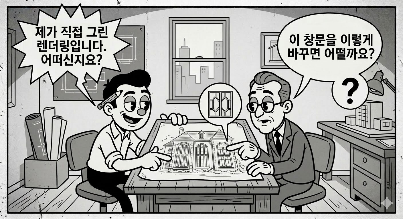 이처럼 거친 스케치는 과정(Process)에 집중하게 만들어 관계를 형성하지만 AI 렌더링은 결과물(Output)에만 집중하게 만든다는 점, 이것이 손 스케치가 다시 떠오르는 이유입니다.
