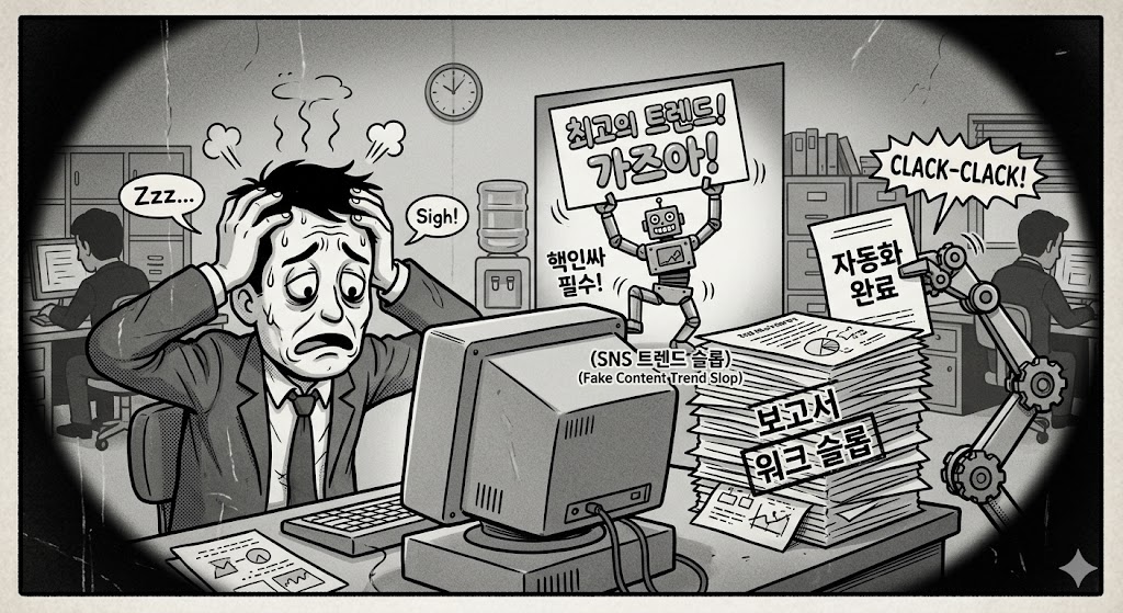 이런 질 낮은 기계적 업무 결과물을 워크 슬롭(Workslop)이라 부릅니다. 소나 돼지에게 주는 잔반(Slop) 같다는 뜻이죠. 요즘 유튜브나 소셜 미디어에 알고리즘을 노리고 AI로 찍어낸 영양가 없는 뻔한 콘텐츠, 이른바 트렌드 슬롭(Trend-slop)이 사람들에게 피로감을 주고 있는데요, 조직 내에서 만들어지는 워크 슬롭을 보며 우리는 똑같은 불쾌감과 불신을 느낍니다.