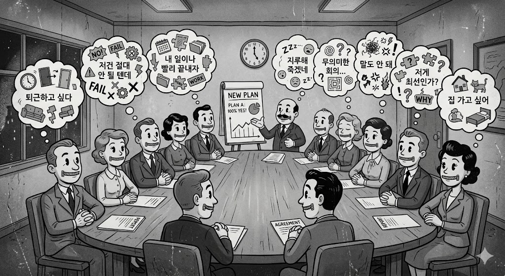 사실 무비판적인 동의는 진정한 합의를 의미하지 않습니다. 사람들은 여러 가지 이유로 고개를 끄덕이면서 동의를 하거든요. 그저 회의를 빨리 끝내고 싶어서, 섣불리 반대 의견을 냈다가 '모난 돌'로 찍힐까 두려워서, 혹은 어차피 내 의견을 말해봤자 바뀌는 것은 없을 거라는 '학습된 무기력' 때문일 수도 있죠.
